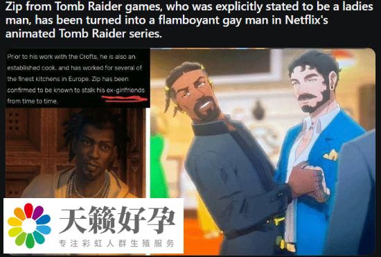 有網友指出,遊戲《古墓麗(li) 影》中出現的人物澤普(Zip)也在動畫劇中登場,遊戲中他的設定是勞拉 · 克勞馥的得力助手和技術專(zhuan) 家,並被被明確描述為(wei) 一個(ge) 花花公子。然而,澤普在動畫劇中卻變成了一個(ge) 男同性戀。