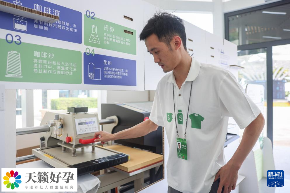3月25日,工作人員在演示製作低碳“咖啡衫”。