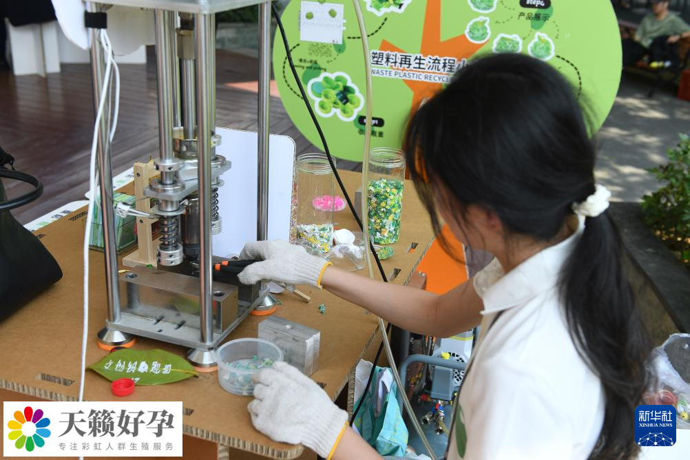 在博鼇零碳示範區內(nei) 的塑料再生流程科普展台上,工作人員展示塑料再生流程(3月25日攝)。